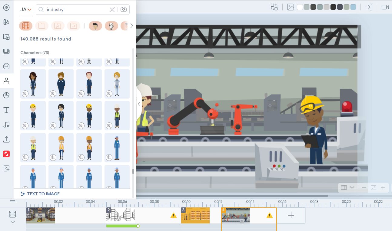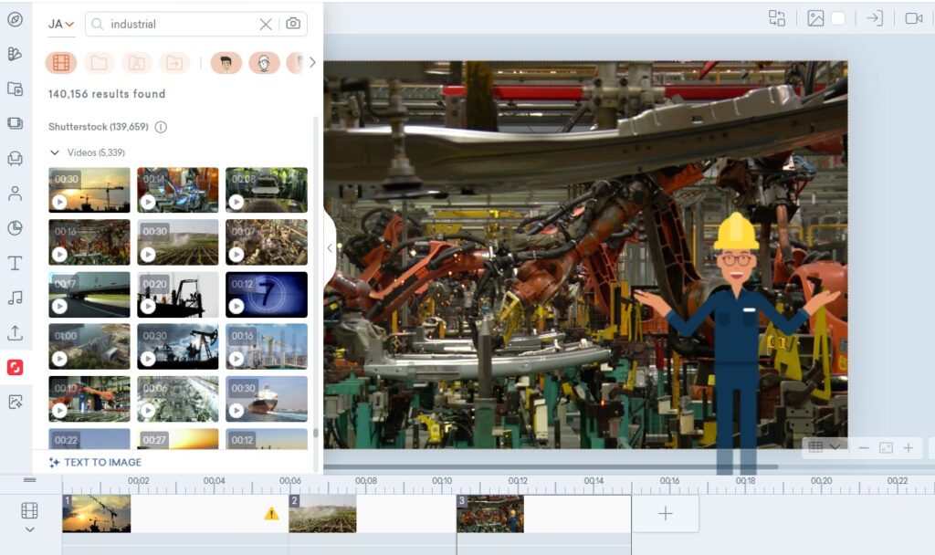 ShutterStockには膨大な数の工場シーン、製造現場のシーンが入っています。VYONDを使えば素材選びに他のツールや素材集を選ぶ必要はありません。
