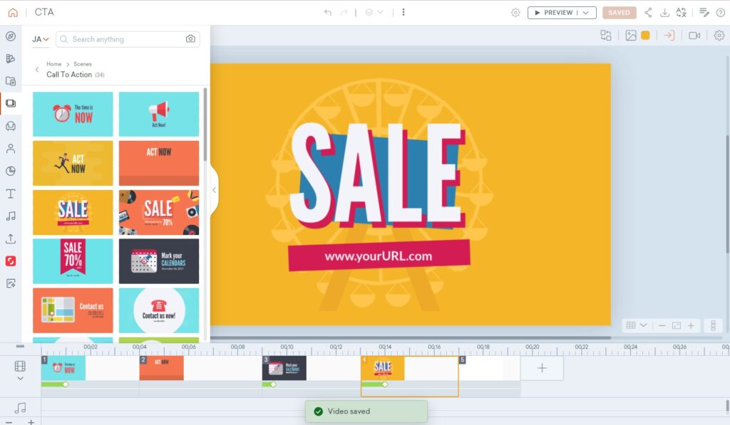 Call to Actionは行動喚起に使うものです。視聴者に何をしてほしいのか?連絡してほしい場合は電話、E-mail、ウェブサイトなどの連絡先、(セールをしているから)購入して欲しいなら「sale」 お店やセミナーに来場して欲しいなら日付や場所をわかりやすく、印象に残るようにアニメーションを作ります。