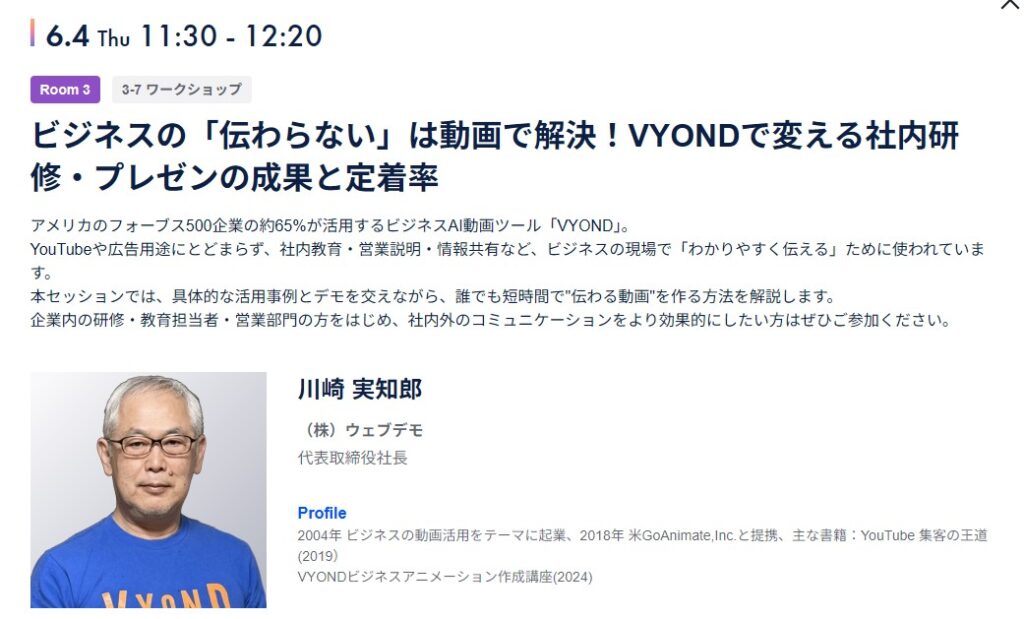 6月4日 11:30~12:20には、ワークショップ会場にて、弊社代表川崎実知郎によるセミナー