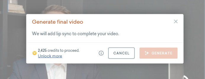VYOND Goのアバターテンプレート生成では、ダウンロードの前にビデオの生成を行う必要があり、再生時間に合わせたCreditsの消費が1,000を超える時があります。Creditsの残りが少なくなると下図のように「GENERATE」が無効になり「Unlock more」のリンクが表示されます。ここで「Unlock more」をクリックします。