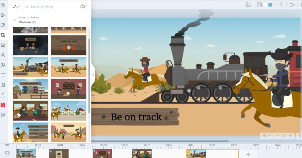 VYONDはアメリカで開発されたアニメーションツールです。開拓精神をイメージするウェスタンシーンはアメリカでの需要は多いシーンです。 ビジネスフレンドリーでは「西部劇(Western)」コンテンポラリーでは「Concepts」カテゴリーに用意されています。