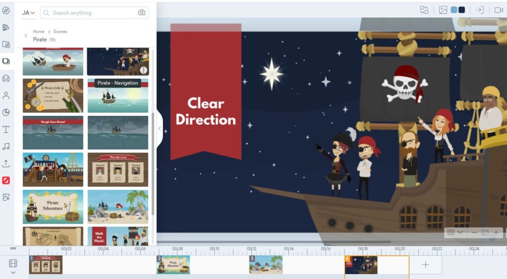 ビジネスアニメーションの作成ツールVYONDですが、様々なシーンの中にはアニメならではのイメージも多数入っています。その中でも、スーパーヒーロー(Super Hero),海賊(Pirates),西部劇(Western)はシーンのカテゴリーにも分類されています。これらのシーンイメージは、視聴者に興味をもって学んでいただくコンテンツとしても活用されています。