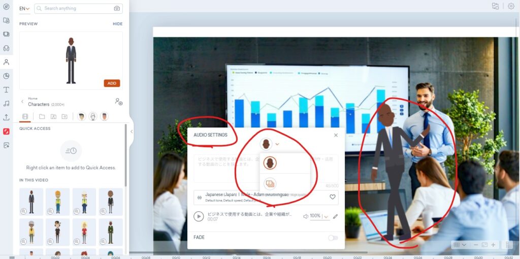 映像だけではインパクトに欠けるので、ナレーションに合わせたキャラクターを登場させてプレゼンテーションさせるようにします。キャラクターを登場させ、画面でプレゼンテーションさせます。また音声の「Settings」をクリックし、音声をキャラクターに指定するとキャラクターがナレーションに合わせて口を動かし、喋っているように表現できます。