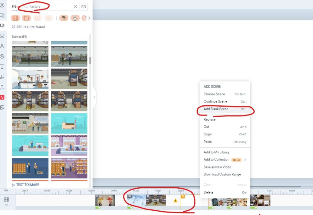 画像ばかりのシーンだけでなく、わかりやすいアニメーションのシーンも挿入してみましょう。変更したいシーンを選択しマウス右メニューから「Add Blank Scene」をクリックし白紙のシーンを挿入した後、アニメーションのシーンを選び挿入します。シーンはご自身でカスタマイズしてもOKです。複数のシーンを入れてテンポよく繋ぐとインパクトがあります。
