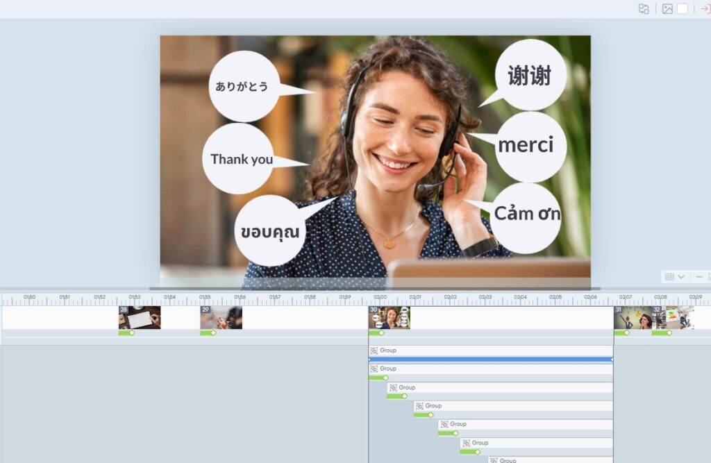 画像にテキストやグラフを追加してみましょう。このシーンでは「多言語対応」というイメージに沿うように画像に様々な言語を使っているイメージを追加してより理解しやすいシーンを作成しています。