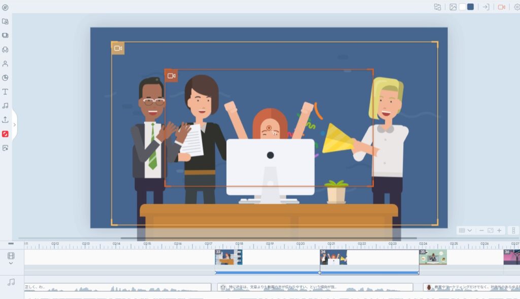 ナレーションに合わせたアニメーションを追加することで、視聴者により説得力のある動画を作ることができます。シーンはカメラをつかったズームも効果的です。