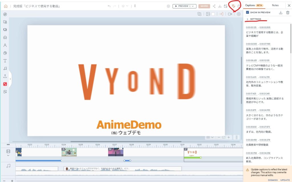 自動字幕では、文字のタイミングと誤字の修正を行ってください。字幕挿入後にシーンの編集を行うと字幕のタイミングがずれてしまうので、自動字幕は編集の最後に行うことをお勧めします。