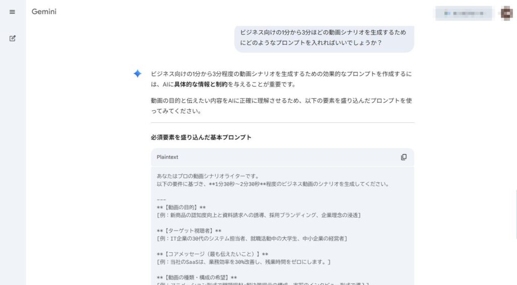 ビジネス向けの1分から3分ほどの動画シナリオを生成するためにどのようなプロンプトを入れればいいでしょうか?