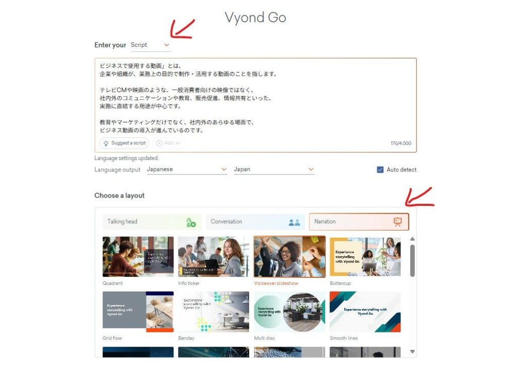 2:作成したナレーション原稿を元にVYOND Go(Text to VIDEO)を使ってVIDEOを作成する