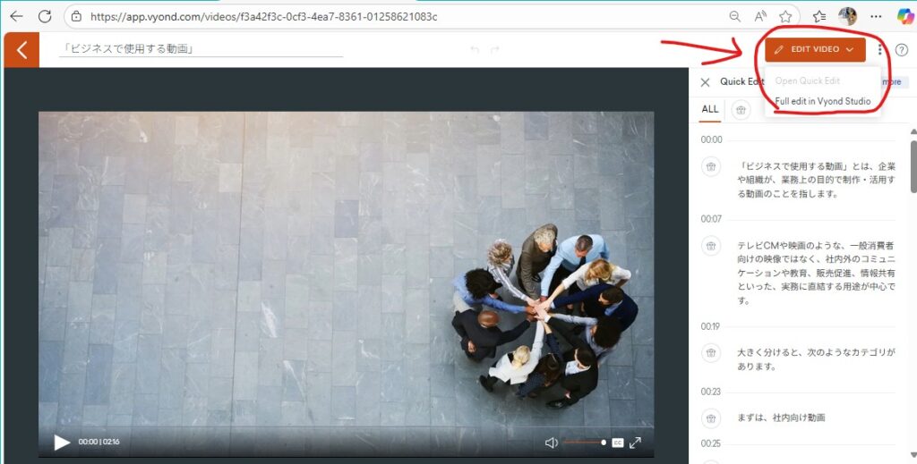 ナレーション入りのVIDEOができたら、シーンの編集を行います。右上「EDIT VIDEO」から「Full edit in Vyond Studio」をクリックします。(またはHome画面からProjectを選択して編集画面へ)