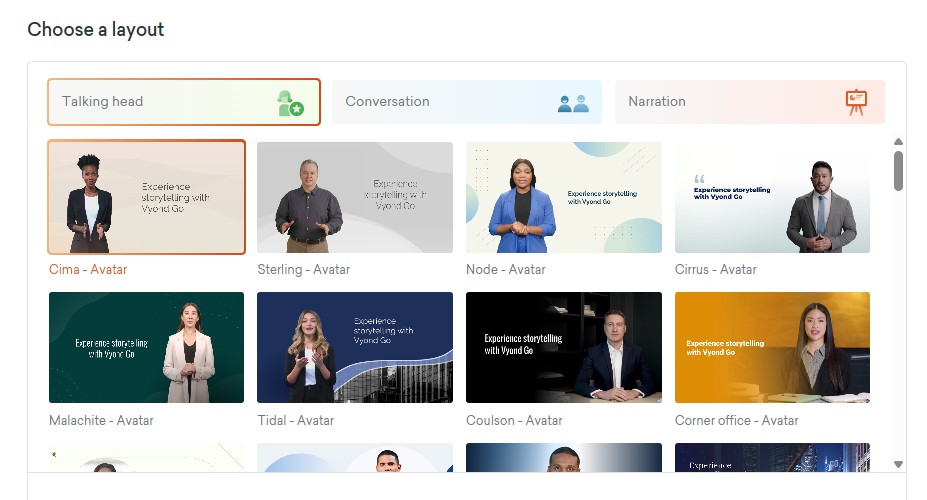 Avatar付きテンプレートとは VYOND Go(Text to Video)のレイアウト「Talking Head」にあるAvatar素材が挿入されたテンプレートです。2025年6月のアップデートに追加された…