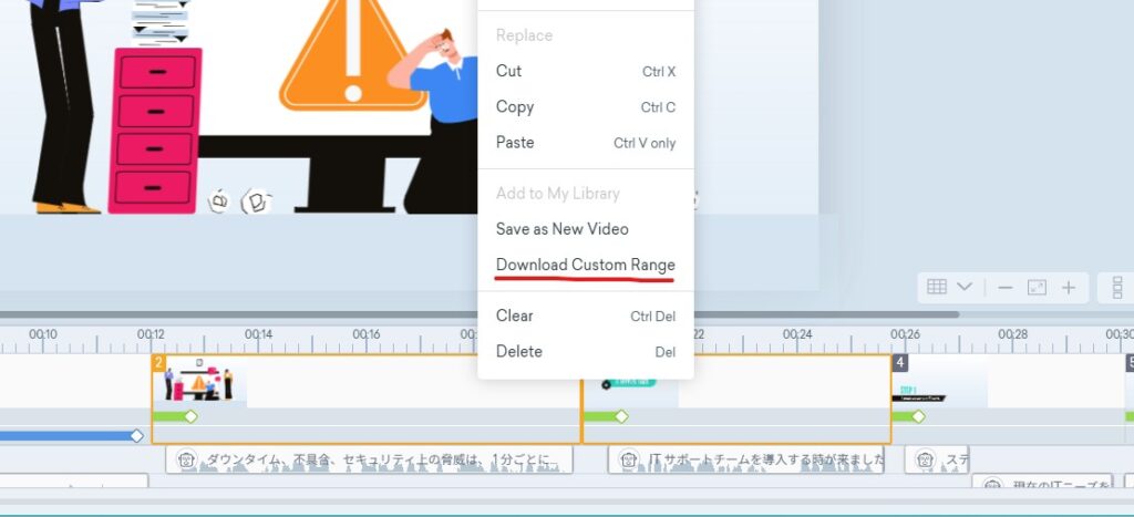 シーンの一部分だけダウンロードしたい時は、シーンを選択し、マウスの右メニューから【Download Custom Range】をクリックして出力したいシーンをダウンロードします。(複数の連続したシーンを選ぶには「shift」キーを押しながらシーンを選択します)