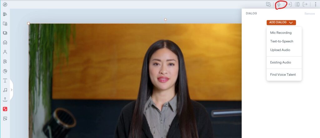 左のメニューアイコン【AI Avater】が新しく追加されています。クリックすると1000以上のアバターが選べるようになり、シーンにアバターを入れることができます。アバターを選択後は左側の【Dialog】(ナビゲーションの上にあるマイクのアイコン)から音声(Mic Recording,Text to Speech,Upload Audio,Existing Audio)を入れます(2026年3月更新)