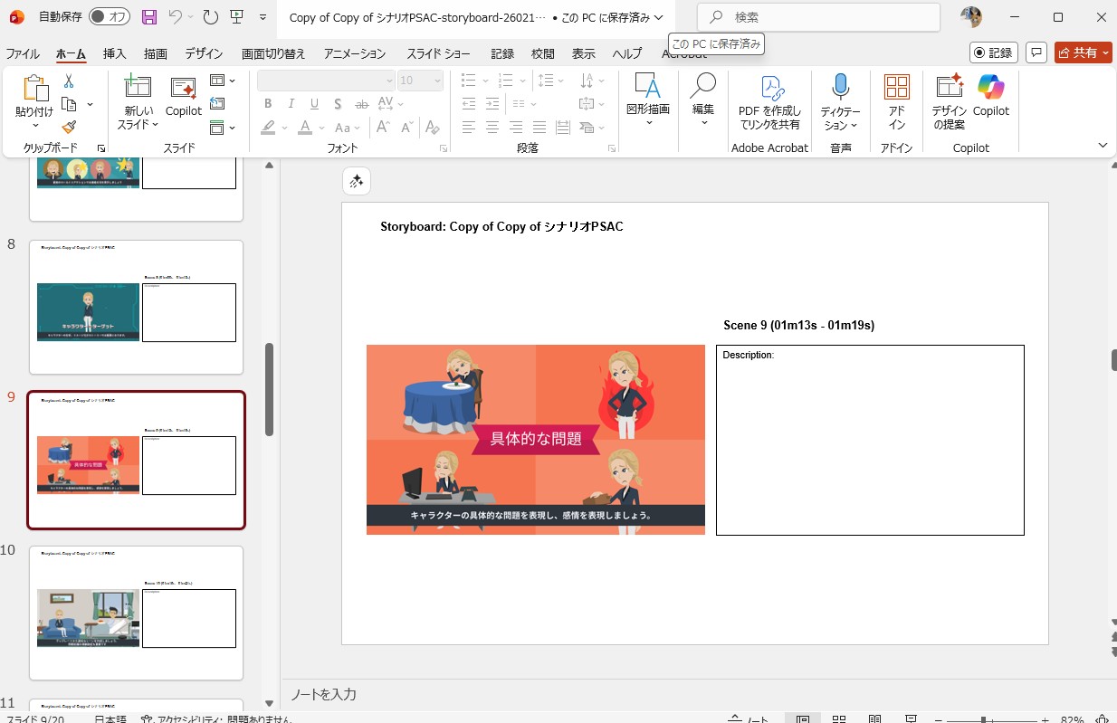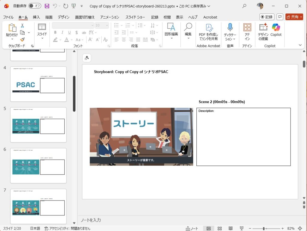 画像(シーン)と説明文を入れる四角が表示され、パワーポイントのデザインやテンプレートは適用されません。