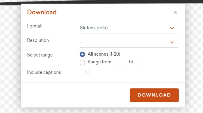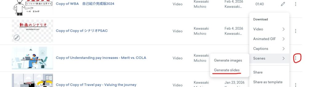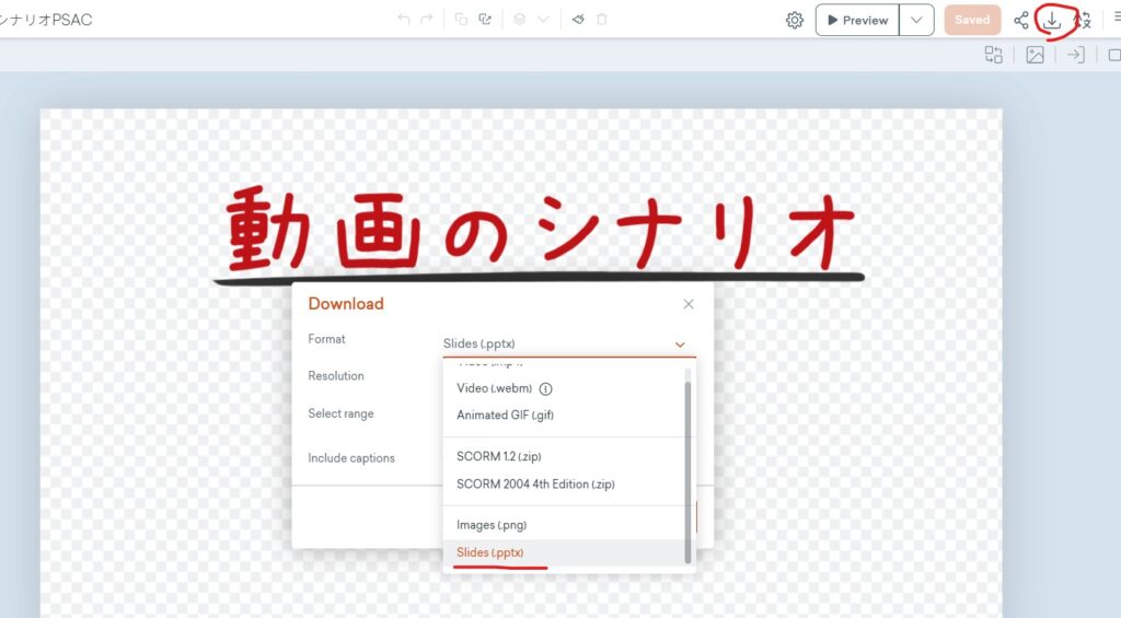 Enterprise・Agencyプランのみ、ダウンロードボタンをクリックして、「Slides(.pptx)を選択します。
