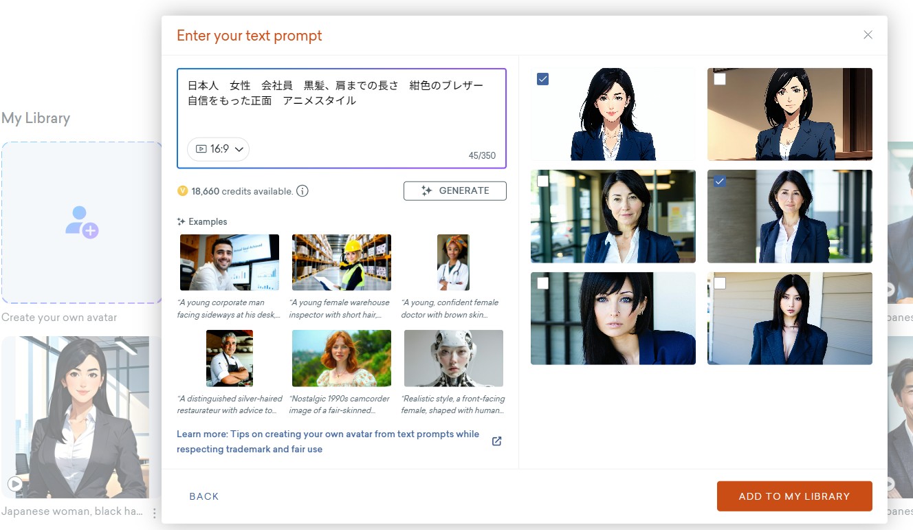何度かGENERATEを行った後、気に入ったAvatarができたら、”ADD TO MY LIBRAY”をクリックします。