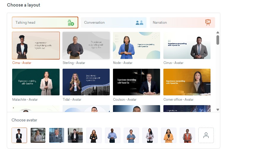 Layout(レイアウト)を選択します。レイアウトはAIで生成する動画の基本パターンで、Conversation(2人の会話を通して解説する)Talking head(1人の登場人物による解説)Narration(キャラクター無しのナレーションとテキスト型解説)になり、それぞれ50以上のテンプレートが用意されています。